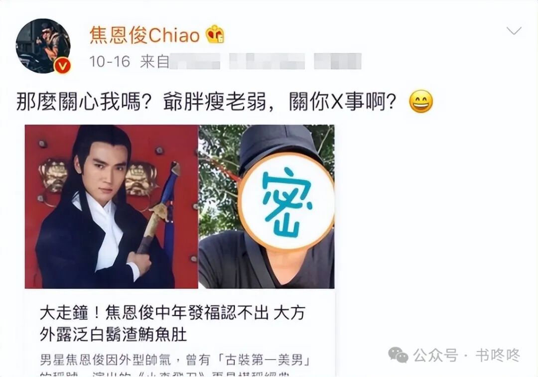 焦恩俊平时虽然不经常更新日常,但是隔段时间大家也总能扒到他的状态,比起年轻的小伙子,依旧可见当年风姿。