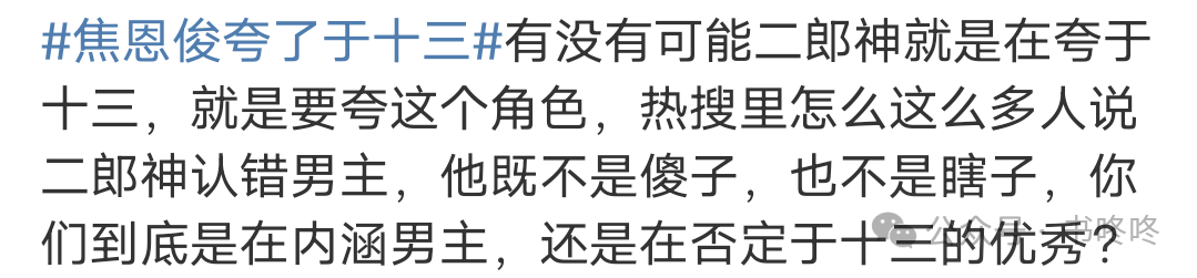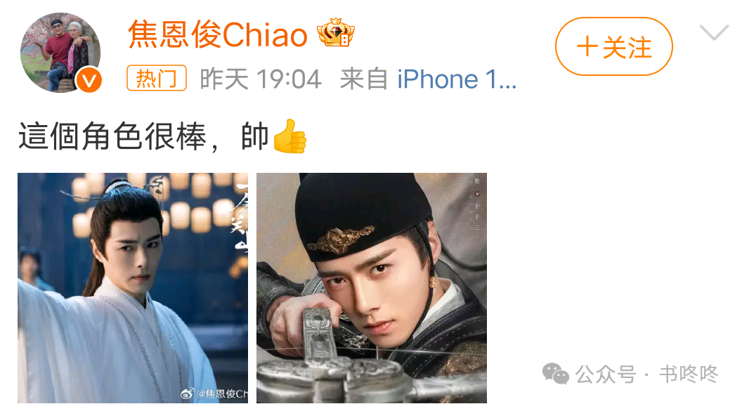 在《一念关山》临近结局的时候,焦恩俊或许也看了这部剧,对剧中男二的角色表示了赞扬和喜爱。
