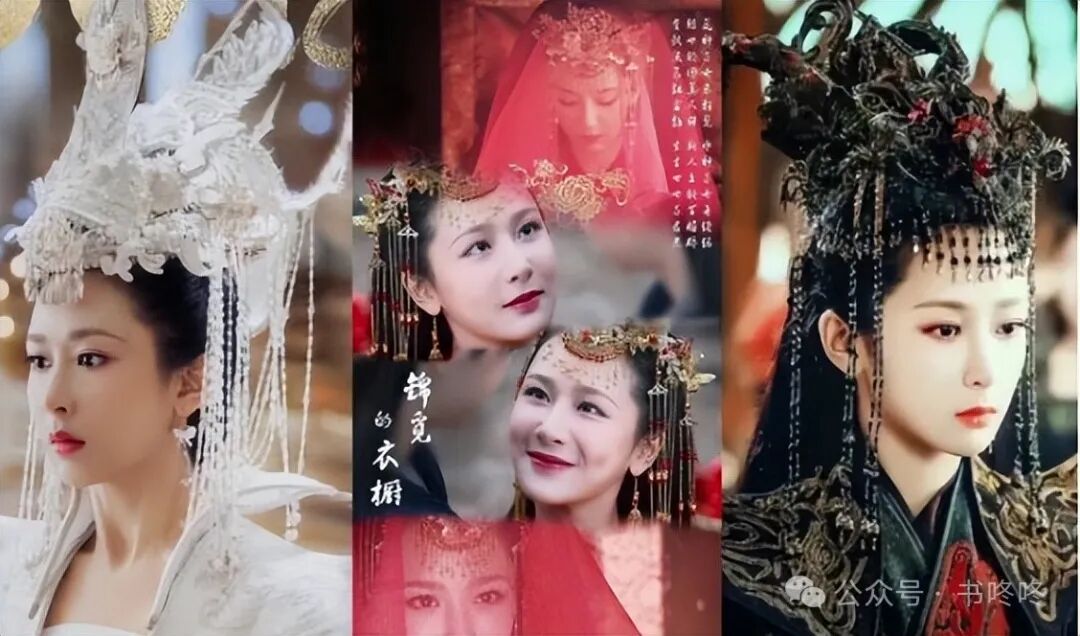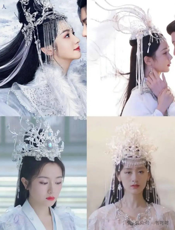 大多女主的发型都是中分加上披肩发,头饰都以小巧为主,主打一个“简约风”,即便是需要奢华的大婚造型,也都是带一个大的发冠了事。