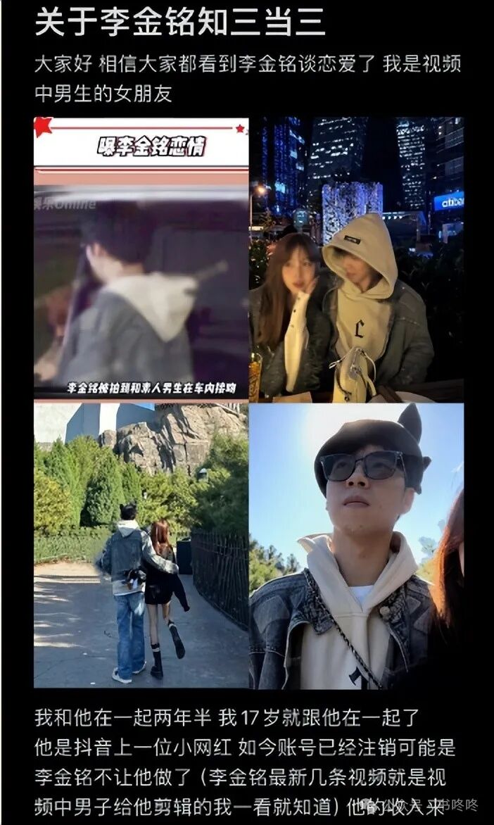 有一个素人女生站出来发声“李金铭知三当三”,她称视频中的男子是她的男朋友,两个人17岁就在一起了。