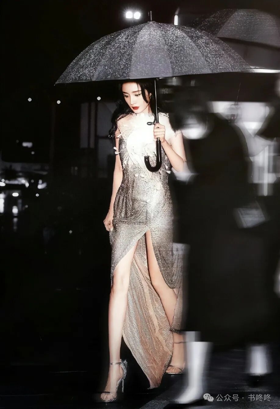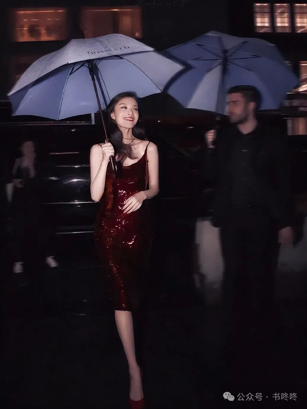 她身着一件紧身吊带酒红色亮片裙,撑伞的照片,直接封神了。