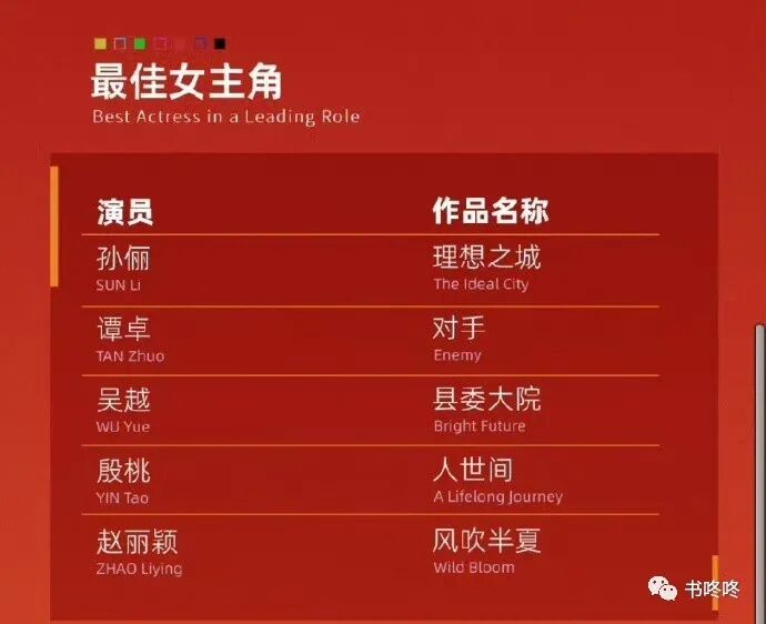 分别是《理想之城》的孙俪,《对手》的谭卓,《县委大院》的吴越,《风吹半夏》的赵丽颖,《人世间》的殷桃等。
