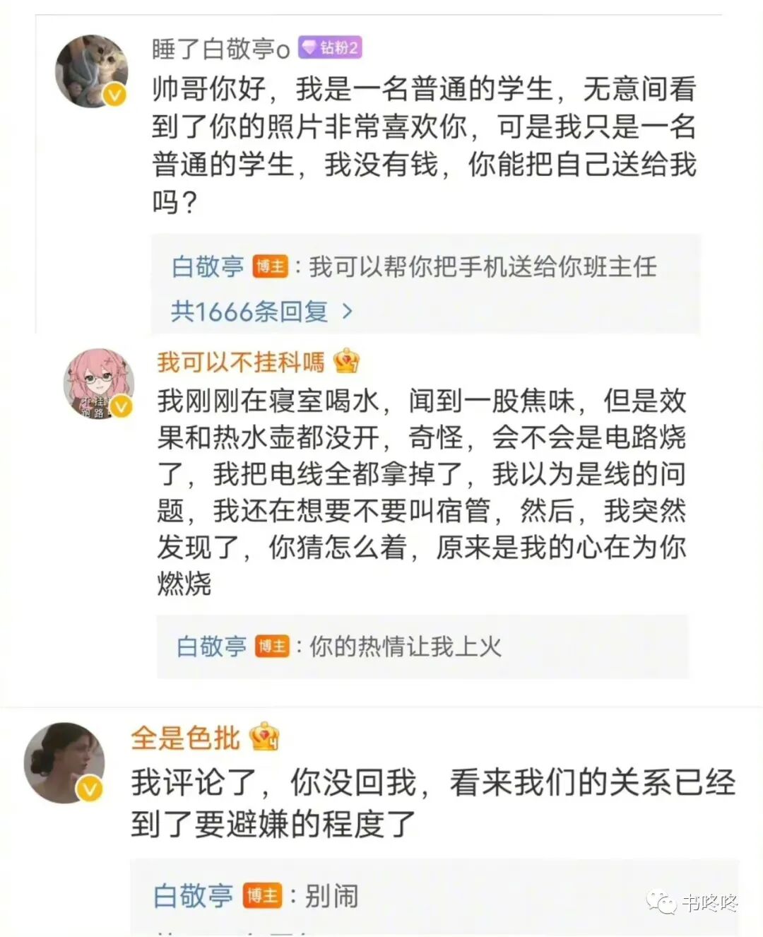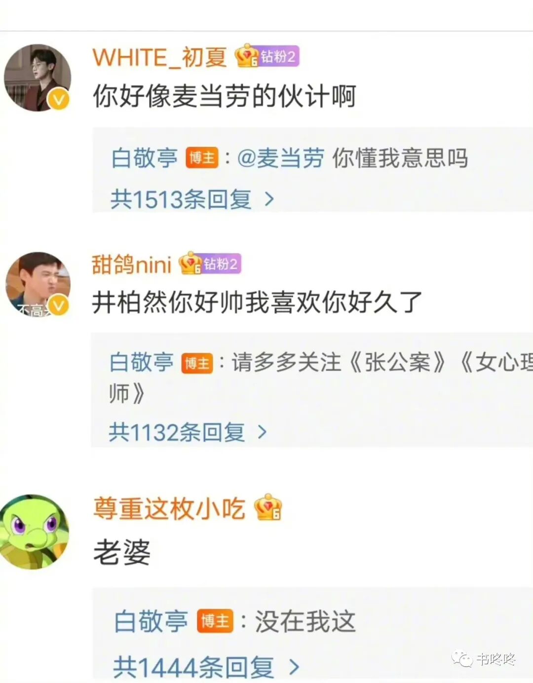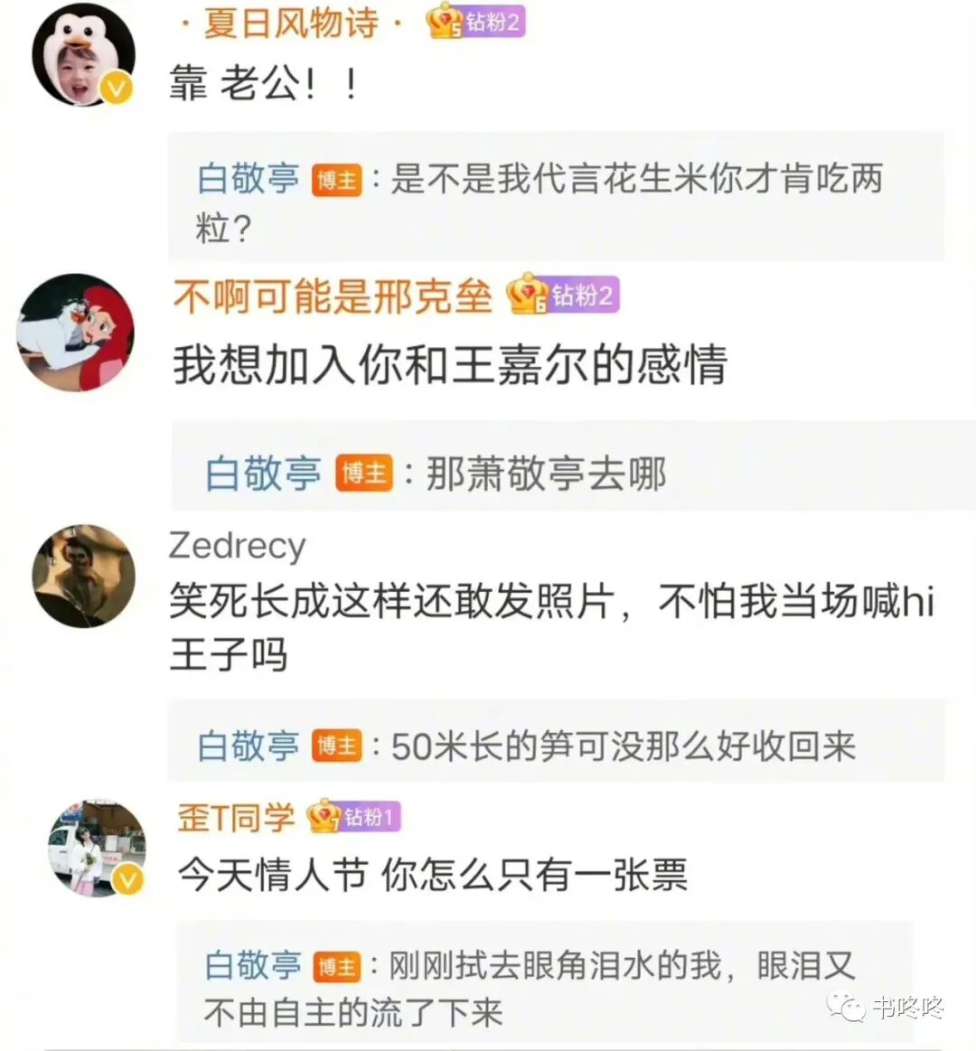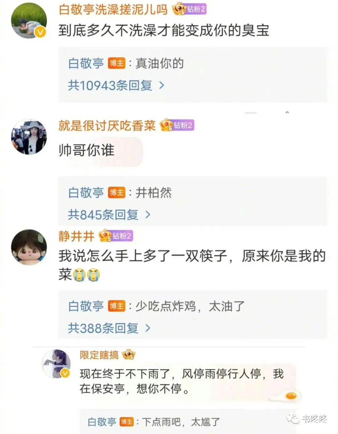 随着在演艺圈的时间越来越长,白敬亭的接梗能力突飞猛进,除了他跟井柏然的互怼日常,他平日里跟网友的交流也逗乐了无数观众。