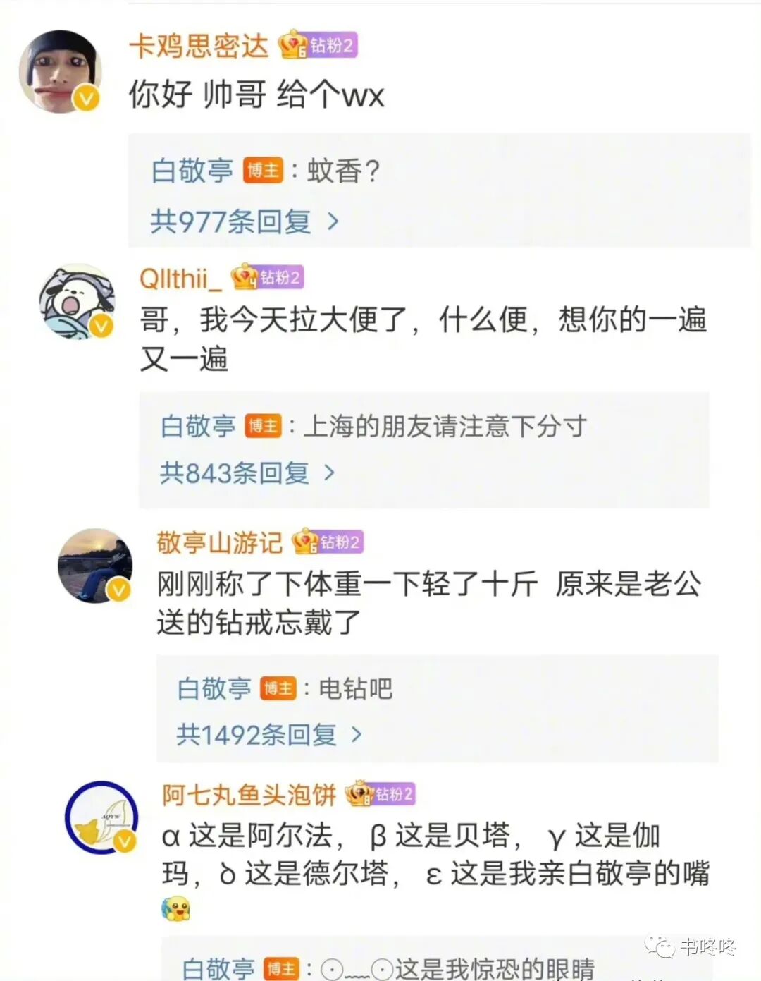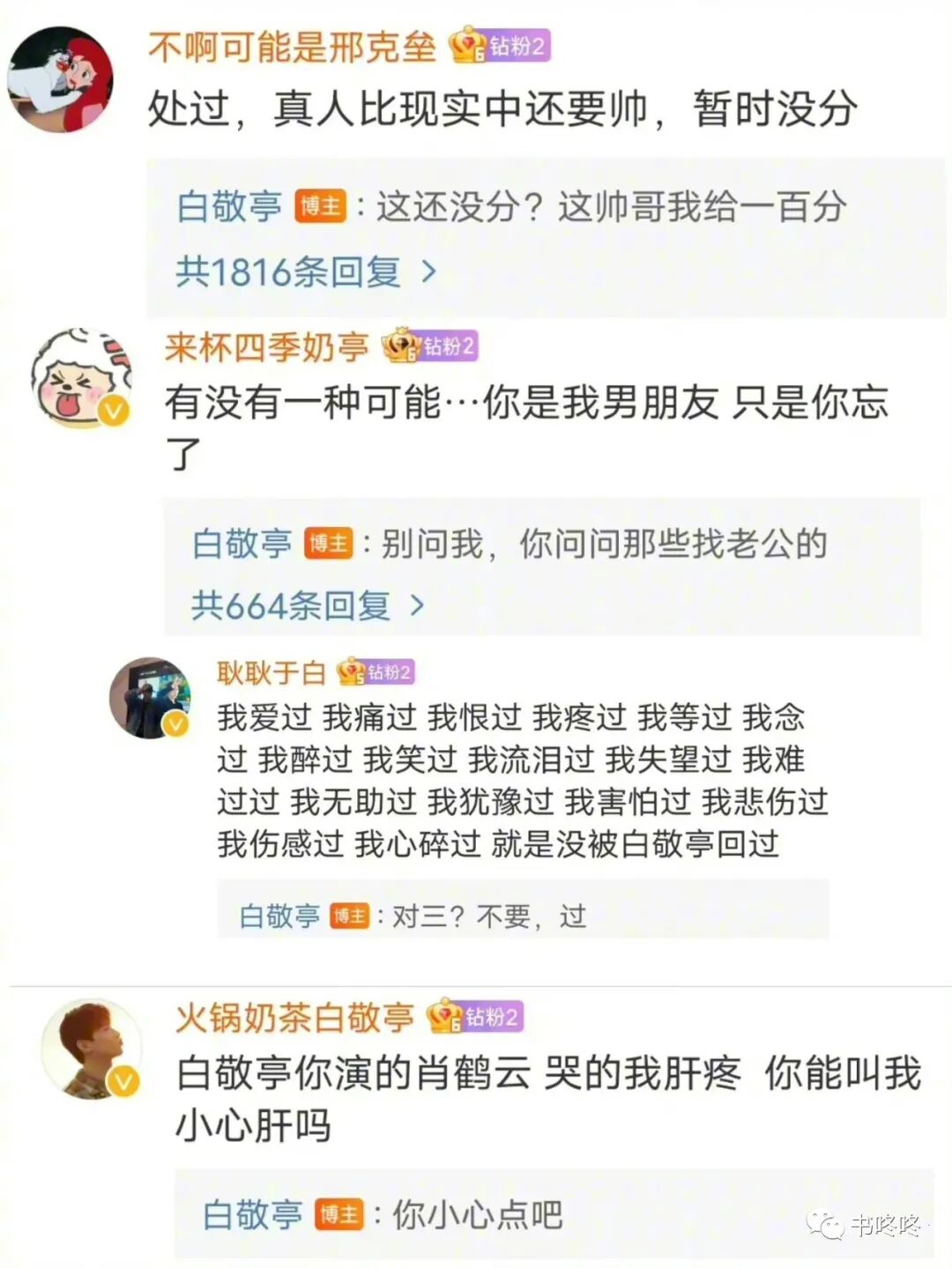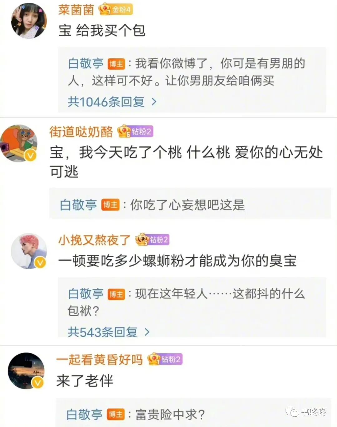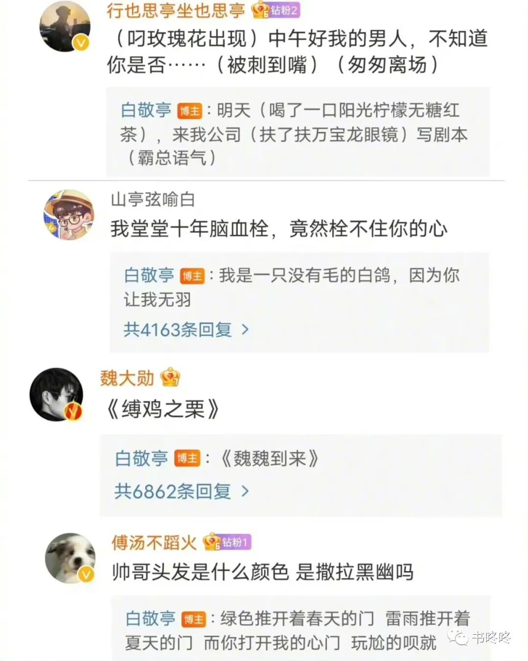随着在演艺圈的时间越来越长,白敬亭的接梗能力突飞猛进,除了他跟井柏然的互怼日常,他平日里跟网友的交流也逗乐了无数观众。