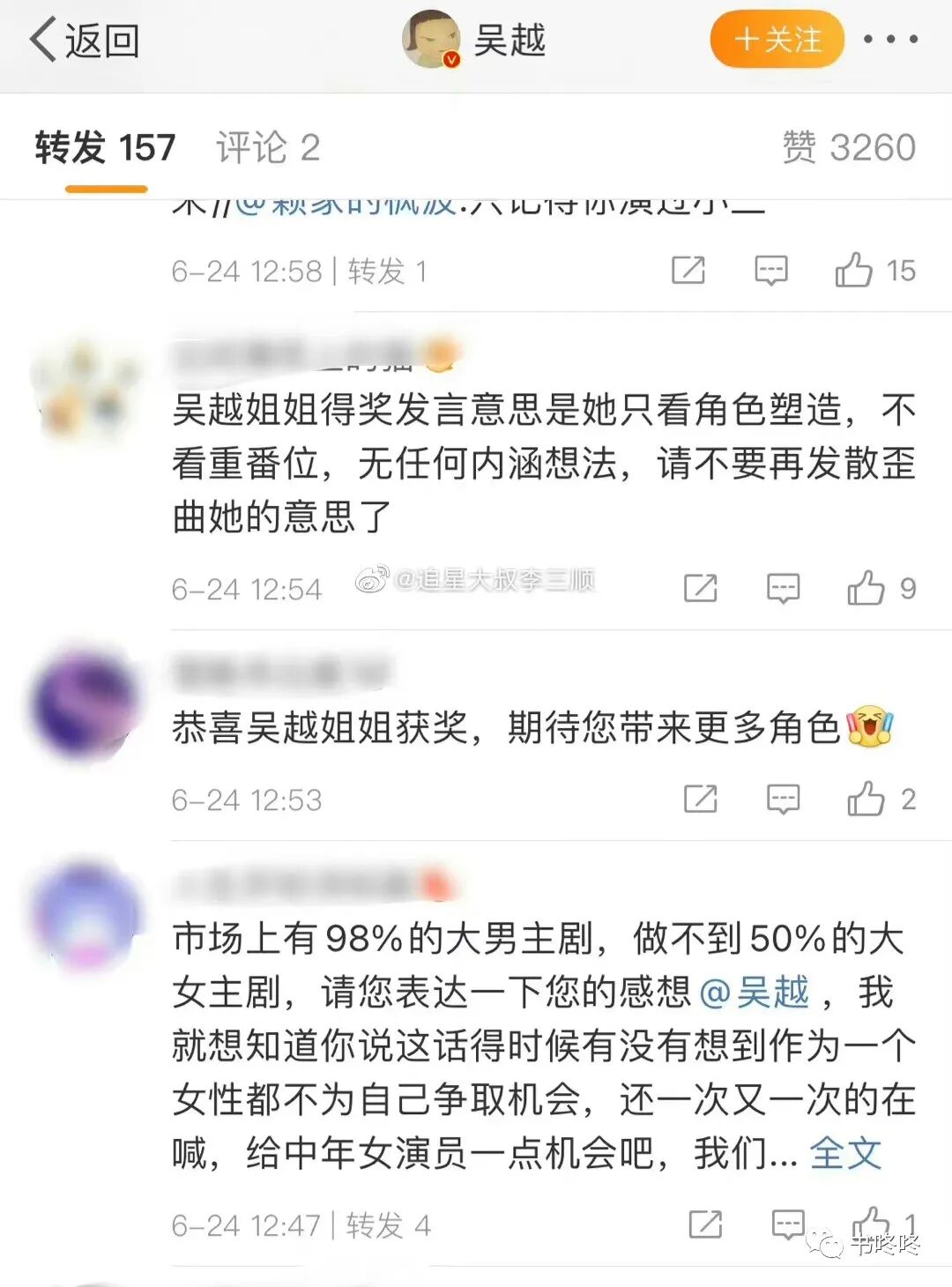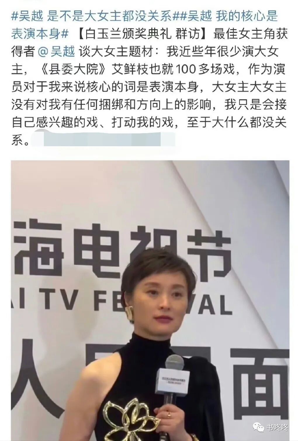 这一次吴越在领奖台上也说了有关最近风行的“大女主剧”,她表示自己已经很久没演过大女主剧了,也不是非这种剧不可。