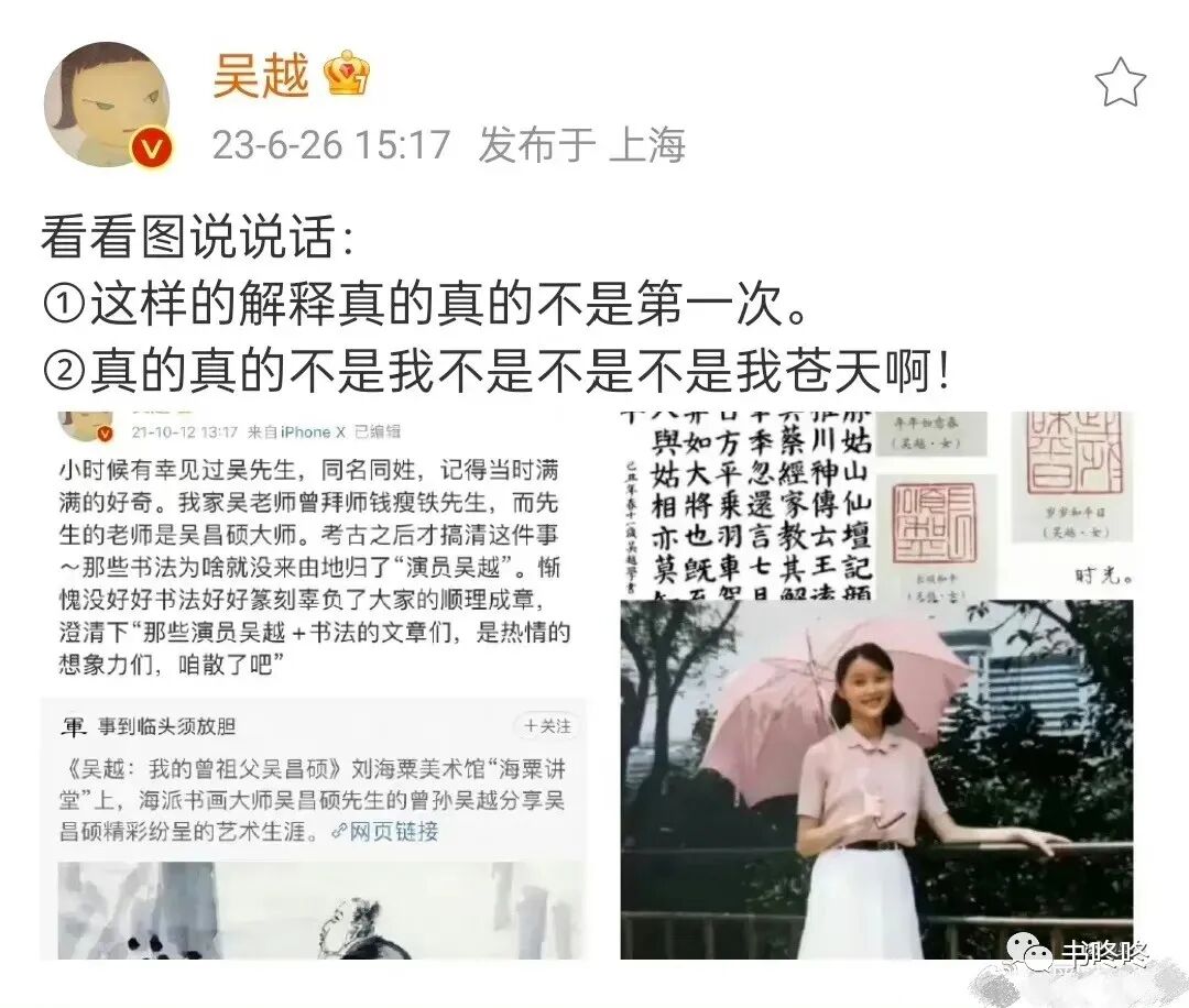 这是吴越对于网上说她的曾祖父是著名画家吴昌硕先生的澄清,有一位跟她同名同姓的人记录了这件事。