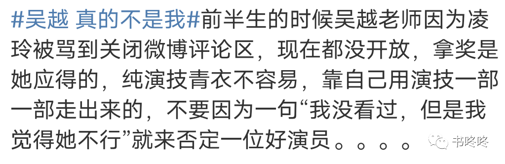 随后吴越再次卷入了一场争议之中,一直戏红人不红,与流量粉丝基本毫无关系的她,意外卷进了一场粉圈大战。