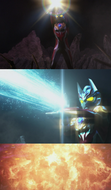 六大究极奥特战士的全部能量并最大化,从交叉成十字形的双手发射出的超最终必杀光线