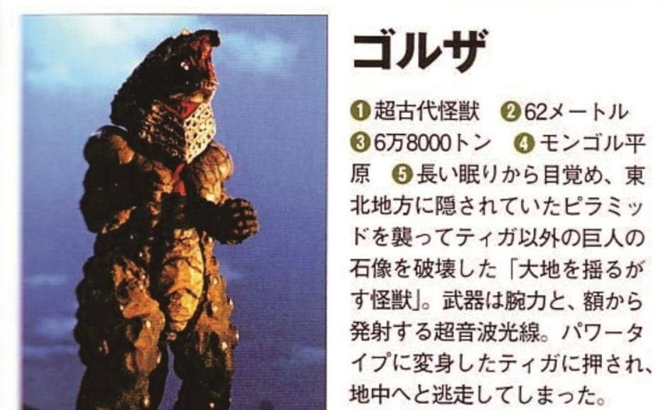 迪迦的宿敌之一,平成系奥特曼中登场的首只怪兽,与第39话登场的超古代怪兽加鲁拉属于同族。