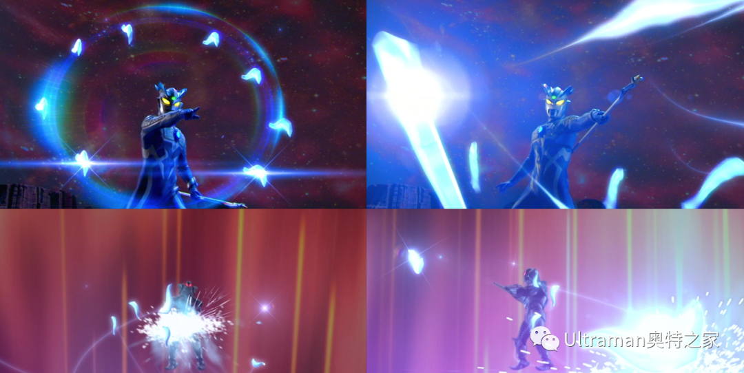 超限赛罗的头镖攻击技能。从四个头镖处发出四个头镖型能量光刃攻击敌人。可各两个形成超限双刃,也可四合一赛罗双剑。通常呈现紫色,银河闪耀状态下则为金色。