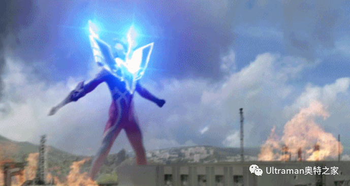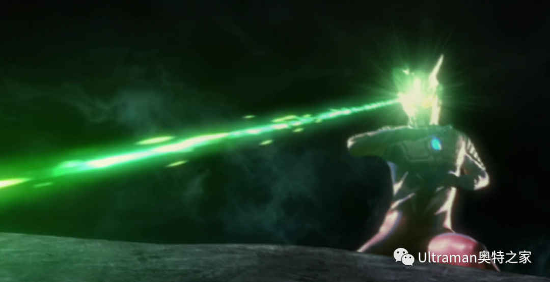 发射姿势和父亲赛文一样(添加了自己伸展左臂的习惯姿势)。