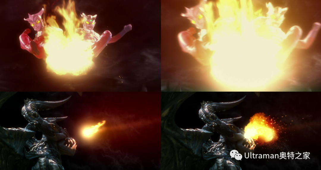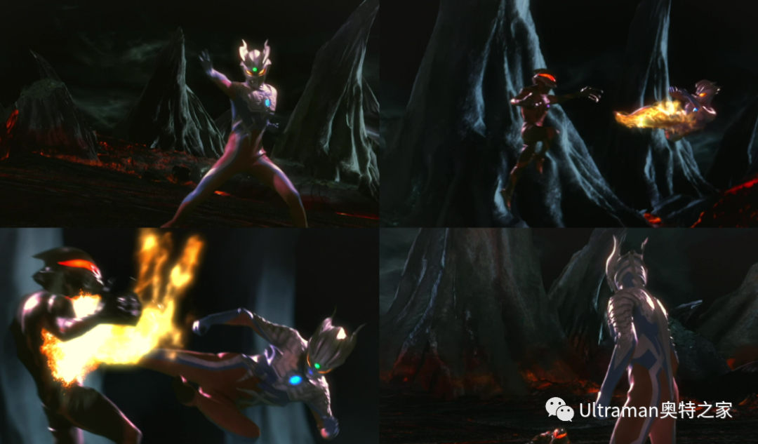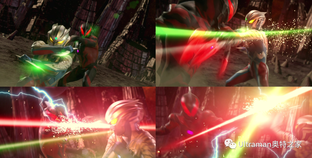 超级赛罗格斗:第一部里有和幻影赛罗对峙光线发出火花的形式,第二部用头镖进行光线反射的方式打中敌人。