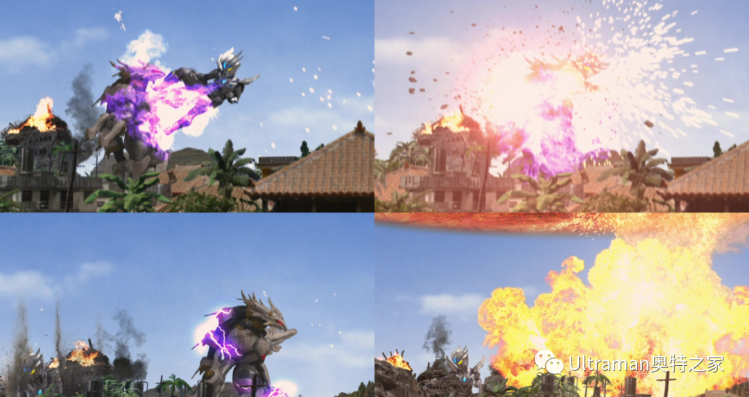奥特格斗欧布:与赛文奥特曼的集束射线、欧布奥特曼:艾梅利姆头镖的集束头镖射线一起共同打到了暴君怪兽泰兰特。