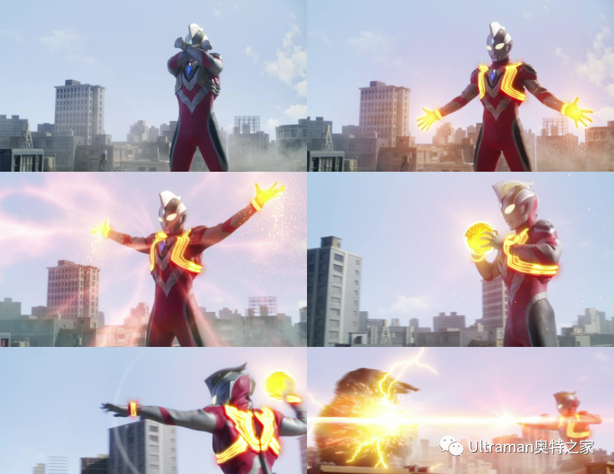 强力型的必杀技,双臂从左右向上聚拢,在胸前积聚起高密度的迪拉修姆粒子,向敌人发射出火红色的超高热光线。还有接住了对方发来的光弹后再投回去这样的变形。