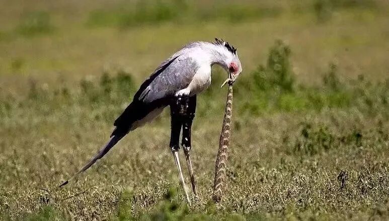这画面,让人觉得似乎很不可思议,但这就是蛇鹫捕蛇的手段,让蛇的其他天敌看了,也得自愧不如。