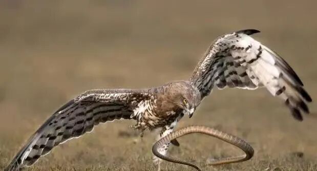 只需要用它们尖锐的利爪,将蛇抓住飞向空中,再高高地抛下去,再厉害、个头再大的蛇也得一命呜呼。