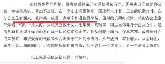 成普在《关于毛岸英同志牺牲情况的回忆》中明确写道:在敌机轰炸时,在办公室有毛岸英、成普、高瑞辛和通信员李某四人。