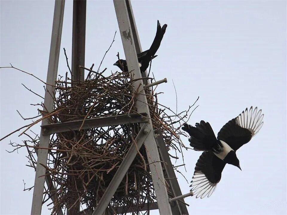 ④喜鹊筑巢在树枝高处很常见,其就怕人为毁坏。但也有喜鹊筑巢在铁塔顶部,虽然避免人为毁坏,但给电力线路正常运行带来很大地安全祸患,原因是筑巢时可能晗有铁丝之类,致使线路接地跳闸地东西。另一方面,假如喜鹊搭窝被意外破坏,为了尽快下蛋孵化,它也就搭个非常简单的窝巢尽快使用。另外经过仔细观察,假如配偶喜鹊一只死亡,那只鸟在死亡鸟边不断徘徊尖叫,然后在窝上方树枝上,哀嚎数日,然后某一天来一群喜鹊叽叽喳喳叫个不停,次日发现窝巢树上又是两只了。