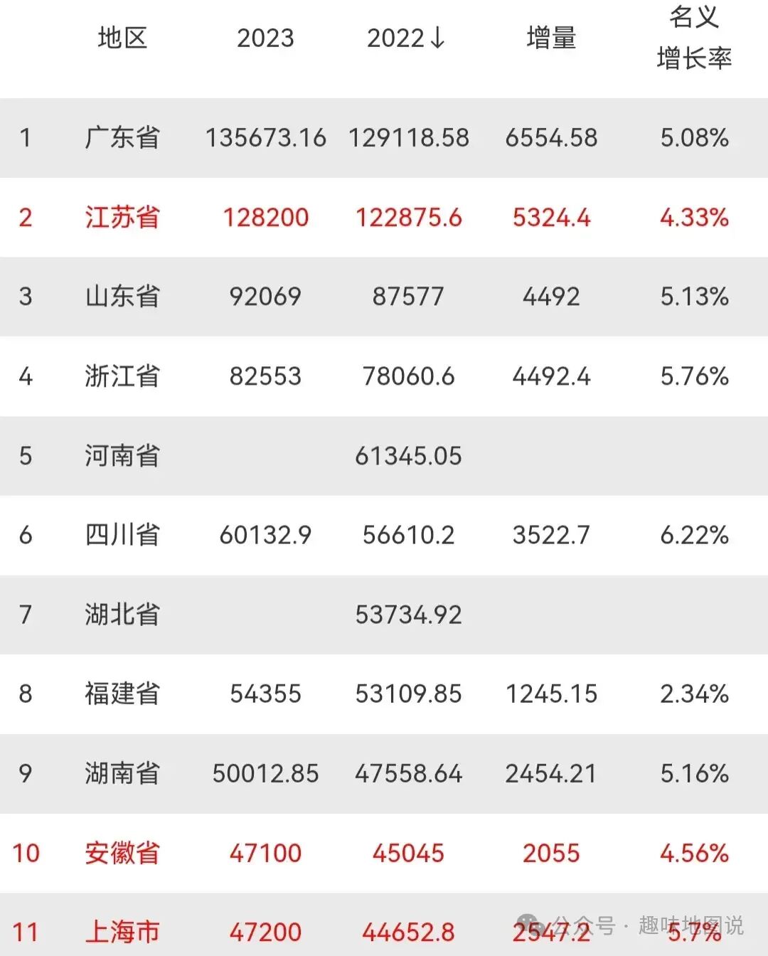 2023年我国GDP排名前十的省份已经公布,分别为广东、江苏、山东、浙江、河南、四川、湖北、福建、湖南和上海。