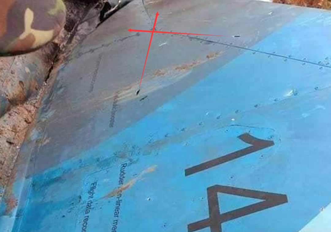 垂尾方向舵盖板,编号1405,这个角度来看,垂尾很完整,认真检查后,前面有几个弹孔,但是并不大,弹孔数量不多,尺寸也很小,而且比较均匀,可能安装的是珠子一类的规则制成品,弹片倾斜从指向前方,导弹弹头大约在垂尾前缘位置爆炸,非常靠近发动机尾部,这也是红外制导导弹攻击的主要区域。