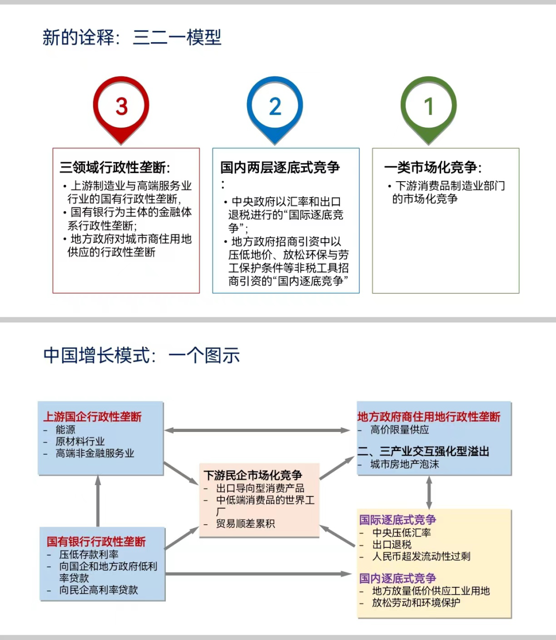 中国当前这个增长模式可以说是“东亚发展型国家”增长模式的一个极端版。传统东亚模式特点就是投资主导、出口导向,政府在发展过程中扮演了一些重要角色,比如压低本币汇率、压低利率,相对也压制劳工,以一个很亲商的政策让本国企业(以及外资企业享受比较优惠的信贷,比较便宜的劳工,让这些企业在不同发展阶段分别实现进口替代,通过国内市场竞争壮大后再推动出口,在国际市场赚外汇。这些东亚经济体一个重要的特点就是相比于全球水平,国内消费能力不足,而投资比例比全世界平均水平要高,结果是产出大于内需,相当依赖出口。中国在这几个方面的表现呢?居民消费占比比东亚经济体相应发展阶段还要更低,而投资占GDP比例比东亚发展型经济体还要高,本来中国这样一个大国,应该对出口的依赖要相对小一点,但实际上中国却相当依赖进出,我们说东亚模式是全世界发展模式的一个极端版本,但这个极端版本是过去70年以来全球发展中快速实现现代化的典范。而中国从1990年代中期以来逐渐演化出来的这个经济增长和城市化模式,我把它称为“三二一模型”,就是说这个模式中存在三个行政性垄断、两类逐底式竞争和一类市场化竞争,三个行政性垄断是什么呢?首先是1990年代中后期之后我们企业改革中有一个所谓的“抓大”,就是在能源、原材料和高端装备这样的制造业上游和一些高端的非金融服务业,比如交通、电信这些部门,国有企业保持相当程度的行政性垄断;其次,中国仍然保持了一个以国有银行为主导的金融体系保持了相当程度的行政性垄断,这个金融体系通过存款利率进行金融抑制,然后对上游国企和地方政府基础设施融资都有较低利率的贷款,但对制造业的民营企业的贷款利率相对是比较高,这里面既有经济上的原因,也有政治风险的原因,因为国有银行给国企贷款,是从左口袋贷到右口袋,如果贷款出了坏账,很难判断说存在寻租,而给民营企业贷款,如果出了问题,大家就会想你这个银行高管跟民营企业是什么关系?