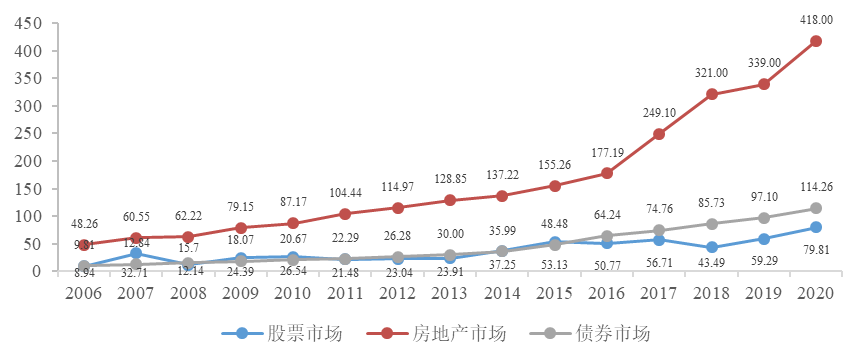 第二,市场的规模不同。据统计,2020年,中国股票市场的市值突破11万亿美元,而在中国的房地产市场的市值中,仅住房一类的总市值就高达62.6万亿美元,大约合418万亿人民币[1] (中国主要资本市场的规模与变化趋势如图1所示)。二者完全不在一个数量级上。按照目前的估算,即使中国的楼市升值完全停止,中国的股票市场的总市值至少要翻6-7倍,才有可能赶上目前中国房地产市场的总市值。如果加上土地、商业、产业形态的不动产,两者的差距会更大。更为重要的是,现在不动产的市值很大程度上构成了上市公司的信用,是其他资本市场(股票、债券)上融资的主要抵押品。中国家庭资产的绝大部分、企业资产的大部分,都与其拥有的各类不动产价值密切相关。一旦不动产的价值下跌,股市不仅不能接替房地产,那些上市企业都会因为资产价值缩水,需要补充抵押品或市场估值降低。那些认为房地产市场抑制了股票市场,股票市场振兴的前提是房地产退出的想法完全违背了基本事实。