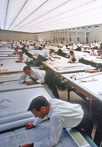在没有绘图软件之前,设计师们常常要自己动手一笔一笔画出设计图,以建筑设计来看,建筑设计稿常常面积很大,但又要十分注重微小的细节,因此画图是一项很艰巨的任务。绘图的场地就像是一个大工厂,每个设计师匹配一个超大的长方形绘图桌或者空白画板,此外设计师通常的设计姿势是“趴着”。