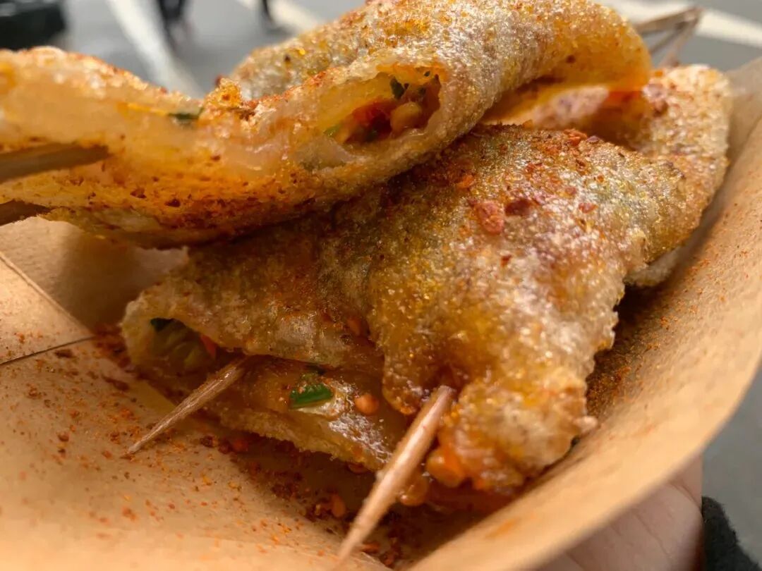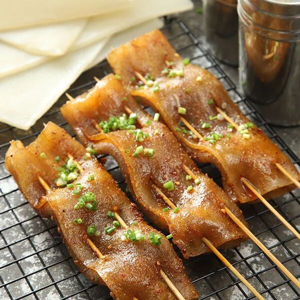 苕皮是用红薯粉经过加工制成的一种食材,也是一种出了川渝地区很难吃到的美味。走上成都的夜市烧烤摊,十个摊中有十个摊都会有烤苕皮,苕皮本身没有什么味道,也就是软糯筋道,但是,当在里面裹上了泡菜萝卜韭菜葱花以后,它就升华了……