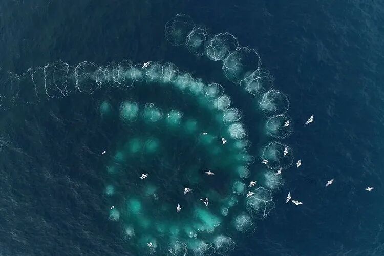 首先派出领头鲸潜进水中找到并锁定磷虾群体,然后它会先吹出气泡防止食物逃走,这时会有通讯鲸鱼通知其他的鲸鱼加入,一起吹气泡,它们会坚守各自的位置吹,直到形成一个类似渔网作用的气泡网,“渔网”形成并且食物无法逃离时,就是鲸鱼们进食的时间了……