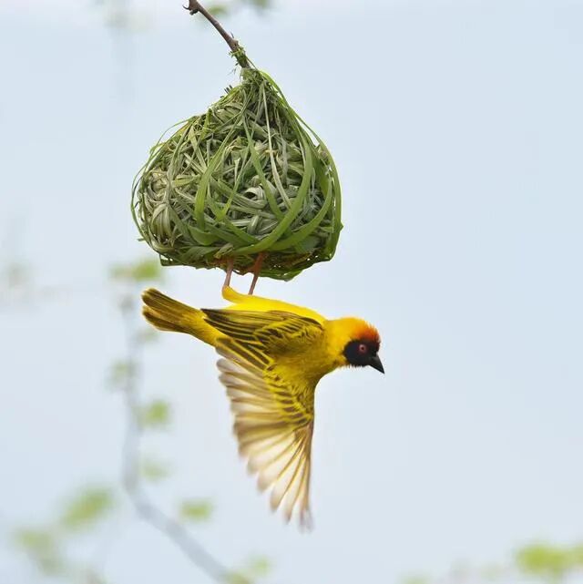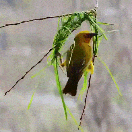 雄性织巢鸟铸造好巢穴后,会等待雌性出现,当发现附近有雌性鸟后,它会将自己倒挂起来,同时拍打自己的翅膀,吸引雌性的注意,仿佛在告诉它: