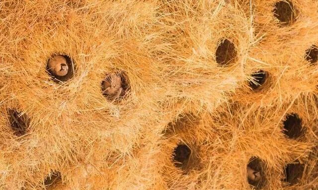 因为它们通常都是一整个家族生活在一起的,建造的鸟巢通常多达有四五百个小“单间”,一个单间住一只鸟都绰绰有余。虽然它们没法建造墙,但是也会精心用干枯的草划分每个单间的边界,在单间中用柔软的材料填满,做成一个十分舒适的小窝。