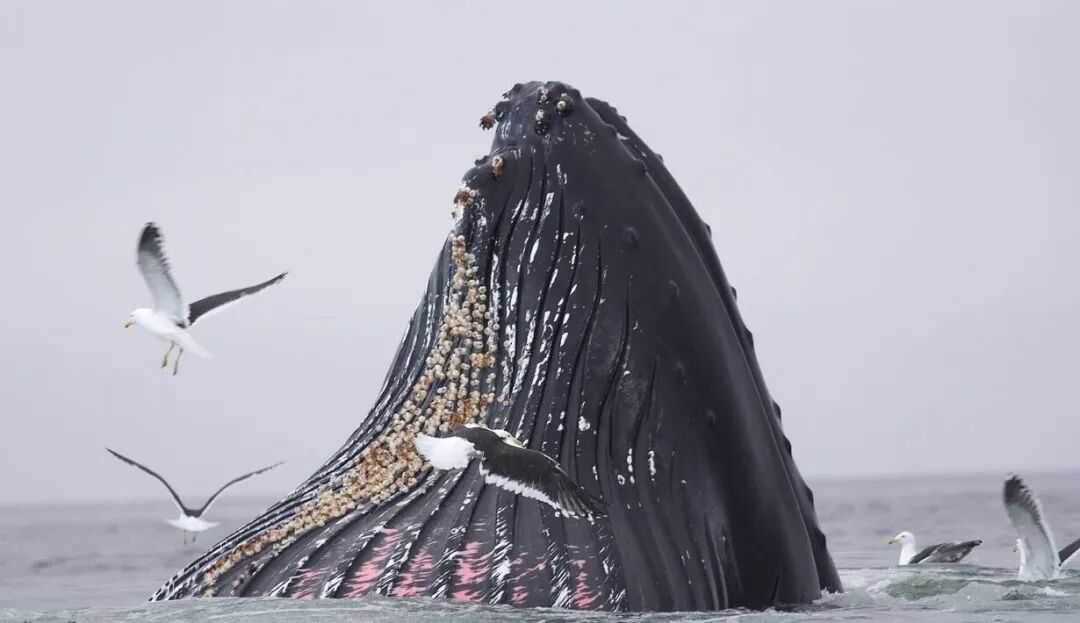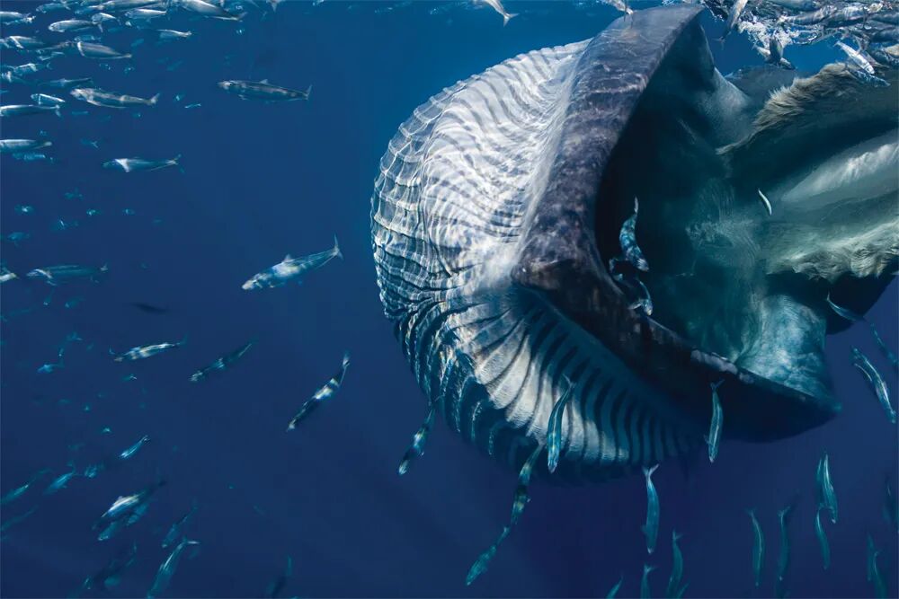 须鲸没有牙齿,需要依靠鲸须过滤小动物进食,体型庞大的它们主食是磷虾、鱿鱼和其他鱼类。另外,鲸鱼是吃不了人的,不是因为不想吃,而是它们的身体结构就注定吃不了。