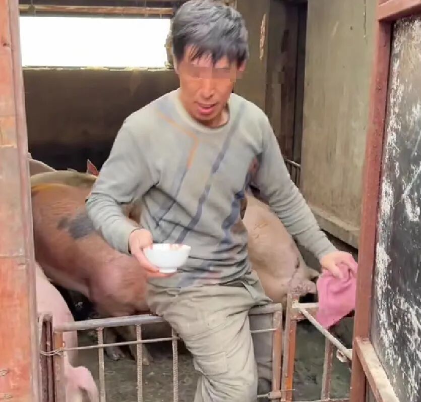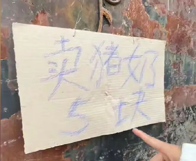 嘿,你还别说,真还找到了一个博主在路边晃悠,看见了一户人家在卖猪奶,明码标价5元/斤。然后他和卖奶的大哥说要拿点来尝尝,大哥用匪夷所思的眼神打量了一下,最终还是进去给他挤奶去了。