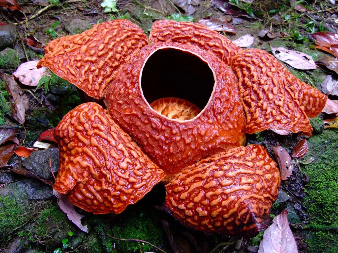 其实它真正的学名叫做大王花,它是肉质寄生草本植物,既没有叶子也没有茎干根系,为自身汲取营养的器官则退化成菌丝状,寄生在其他植物的根茎之上吸取养分。