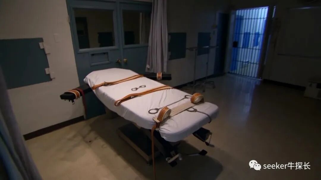 仔细看,这是一张专门用来注射死刑的轮床,囚犯会被五花大绑,在惊恐的眼神中,被注射一剂致命毒素,只需要5分钟,就能让人当场去世。