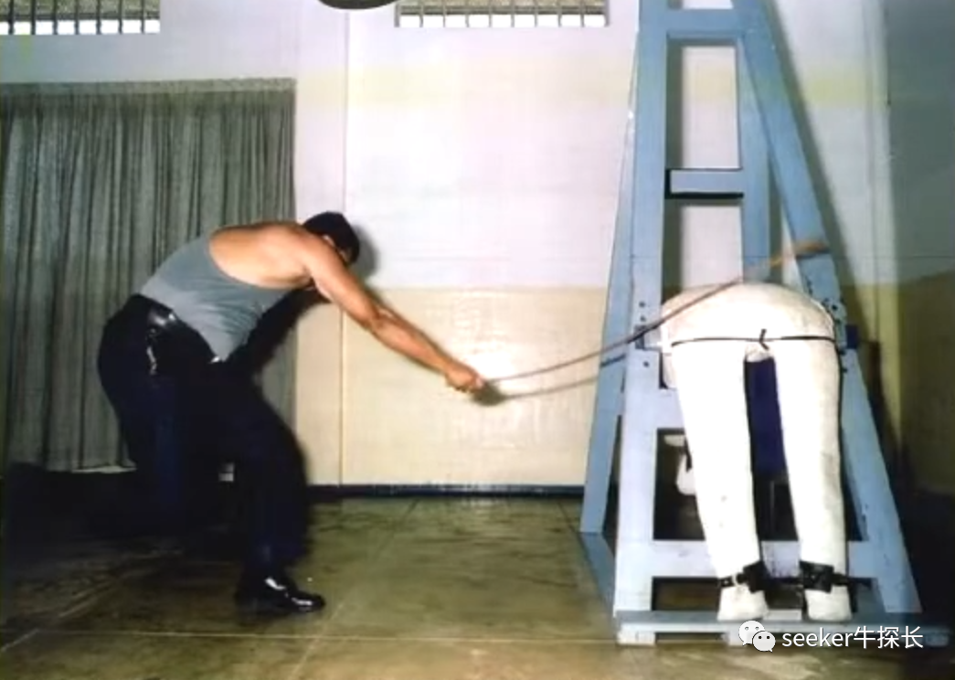 就像打高尔夫球一样,利用腰腹的核心力量,让鞭子360度高速旋转,用离心力把鞭子抽出,这样的话,既能借用藤条的韧性,给囚犯强烈的疼痛感,又能避免用力过猛,把囚犯打成残废。