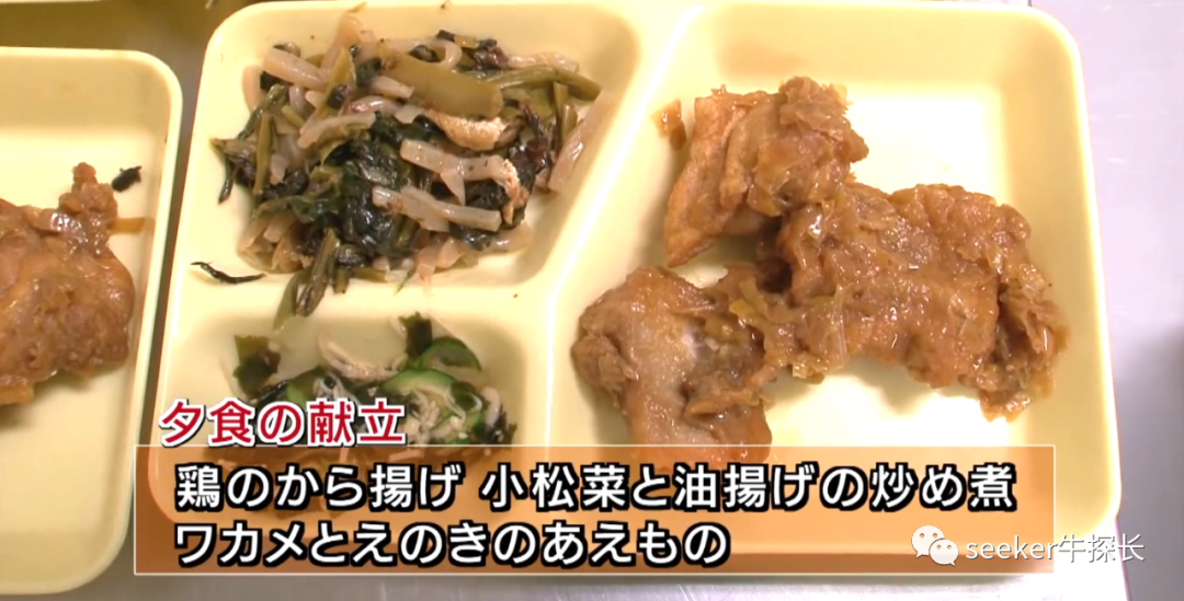 午饭和晚饭完全一样,主食也是大麦饭,配菜包括小松菜炒豆腐,裙带菜炒黄瓜和一份炸鸡。