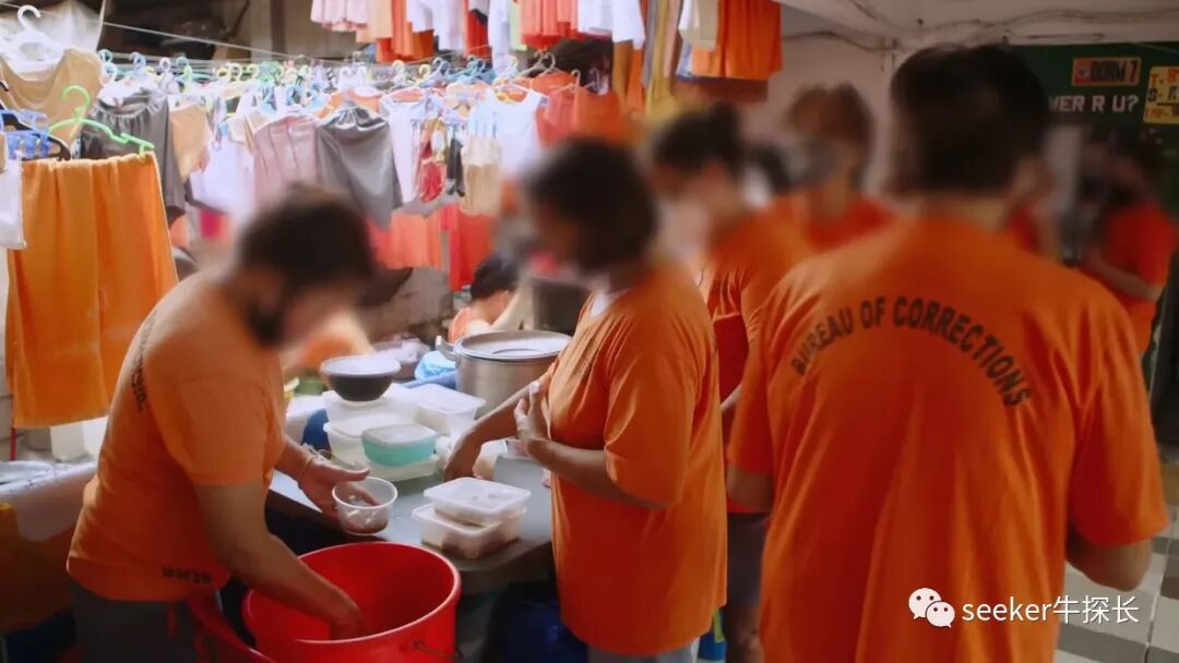 监狱没有集中餐厅,所以每到饭点,囚犯们都需要到集中点排队打饭,然后再回到各自的牢房区吃饭。