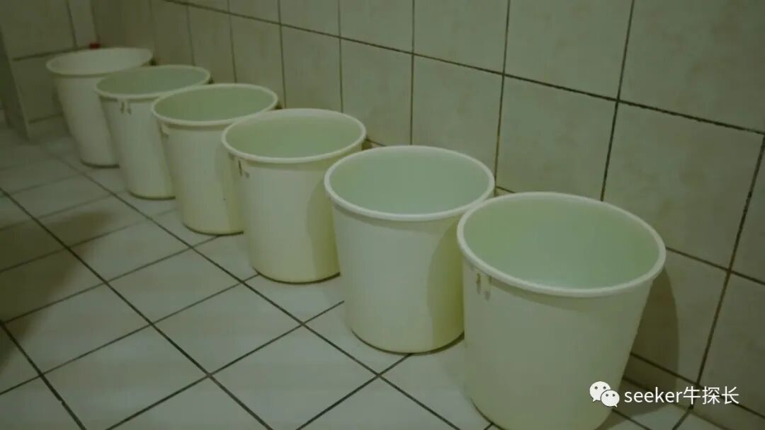 这一排整整齐齐的白色水桶,就是每天用来冲厕所的全部储备。