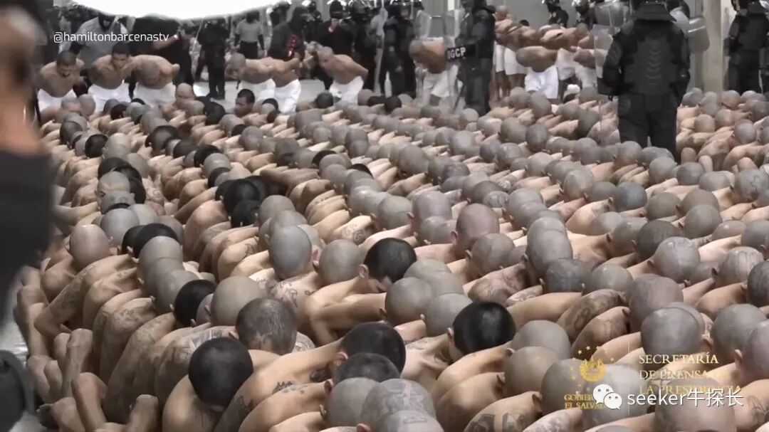 视频中的画面,是今年3月份,中美洲国家萨尔瓦多“恐怖主义监禁中心”转运第一批2000名囚犯入驻新监狱时的真实影像。