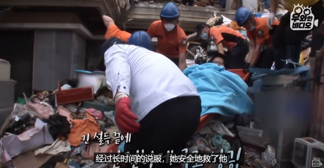 节目组找来志愿者和救援队,并动用大型挖掘机,才在二层垃圾堆里挖出一个通道。