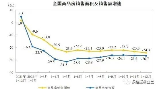 根据国家统计局的数据,2022年全国商品房销售面积135837万平方米,比上年下降24.3%,其中住宅销售面积下降26.8%,商品房销售额133308亿元,下降26.7%,住宅销售额下降28.3%