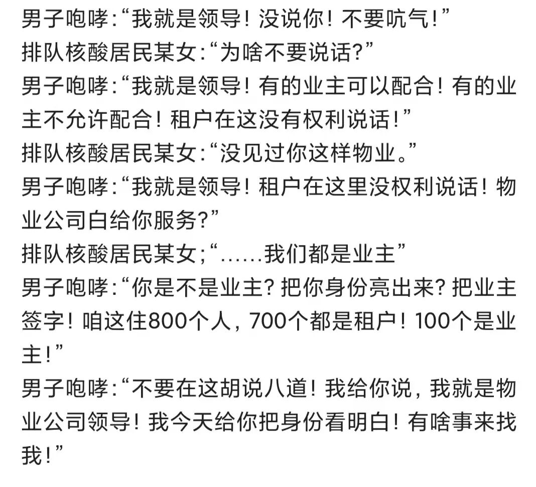 1、以西安某小区的一起事件为例,一位自诩为物业领导的男子在业主排队时,态度傲慢,言辞偏激:“我就是领导!有的业主配合,有的业主不配合!租户在这没资格说话!”、“你是业主吗?亮出你的身份!要业主签字!我们这里有800个人,700个是租户,100个是业主!”、“别在这瞎嚷嚷!我告诉你,我就是物业公司领导!我今天要查清你的身份!有事就找我!”尽管事件的细节仍需深入调查,但这位物业领导的言行无疑暴露了物业公司内部存在的一部分态度嚣张、行为跋扈的问题。