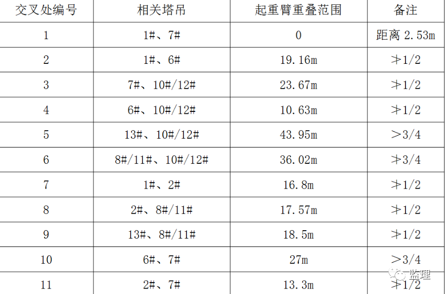 1#塔吊与7#塔吊不存在交叉的情况,1#塔吊与6#塔属于起重臂交叉不大于1/2臂长的情况,7#塔吊与10#/12#塔吊属于起重臂交叉不大于1/2臂长的情况,10#/12#塔吊与6#塔吊属于起重臂交叉不大于1/2臂长的情况,13#塔吊与10#/12#塔吊属于起重臂交叉大于3/4臂长的情况,8#/11#塔吊与10#/12#塔吊属于起重臂交叉不大于3/4臂长的情况,1#塔吊与2#塔吊属于起重臂交叉不大于1/2臂长的情况,2#塔吊与8#/11#塔吊属于起重臂交叉不大于1/2臂长的情况,13#塔吊与8#/11#塔吊属于起重臂交叉不大于1/2起重臂长的情况;6#塔吊与7#塔吊属于起重臂交叉不大于3/4起重臂长的情况;2#塔吊与7#塔吊属于起重臂交叉不大于1/2起重臂长的情况;7#塔吊与8#/11#塔吊属于起重臂交叉大于3/4臂长的情况。
