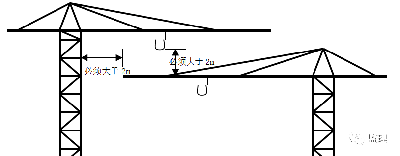 1、起重机之间最小安全距离,应保证处于低位的起重机臂架端部与另一台起重机塔身之间至少有2m的距离,为防止塔吊的长臂与相邻塔吊的塔身相碰,部分塔机采用缩短臂长,以确保运行安全距离。
