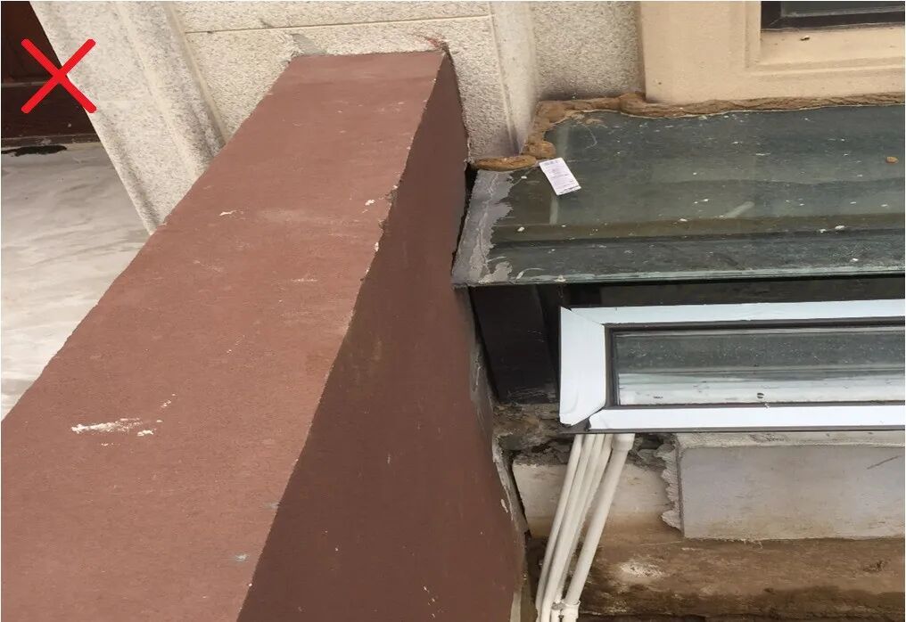 3、块材类饰面层 (如石材),细部材料加工时遗漏滴水线做法。