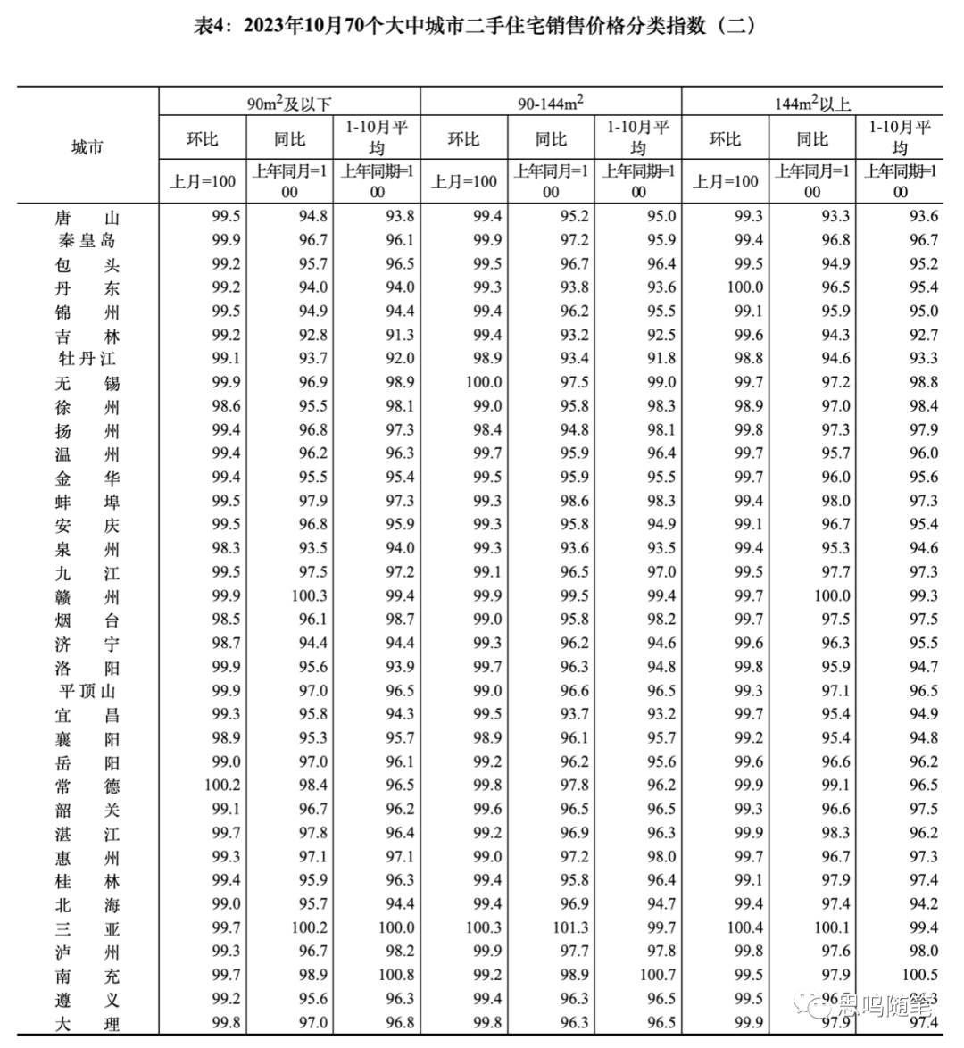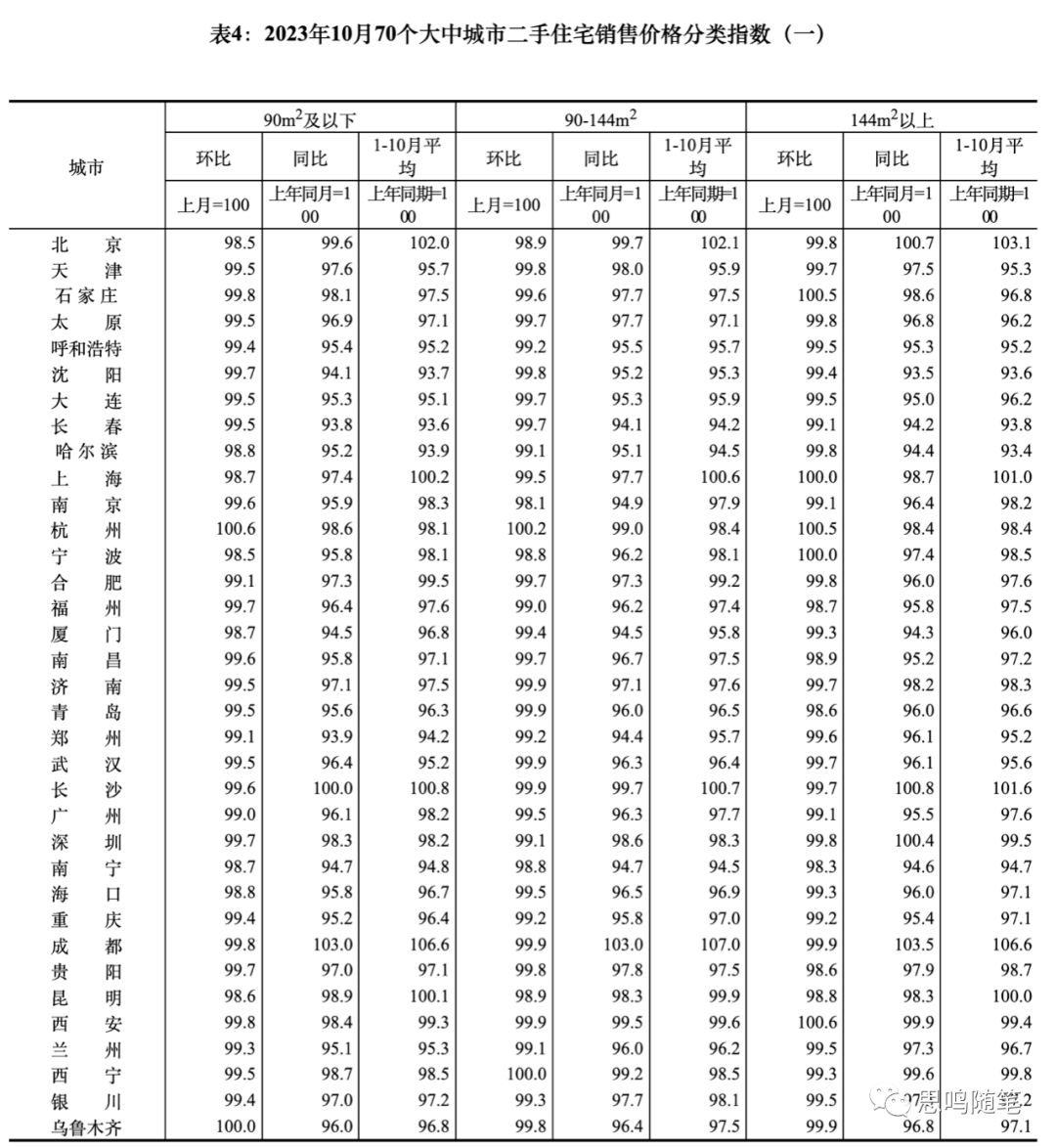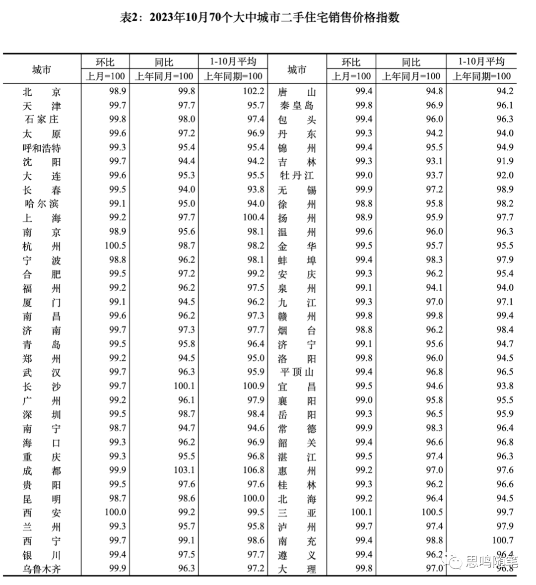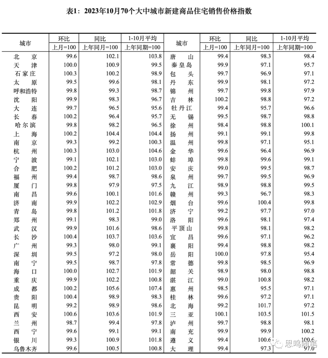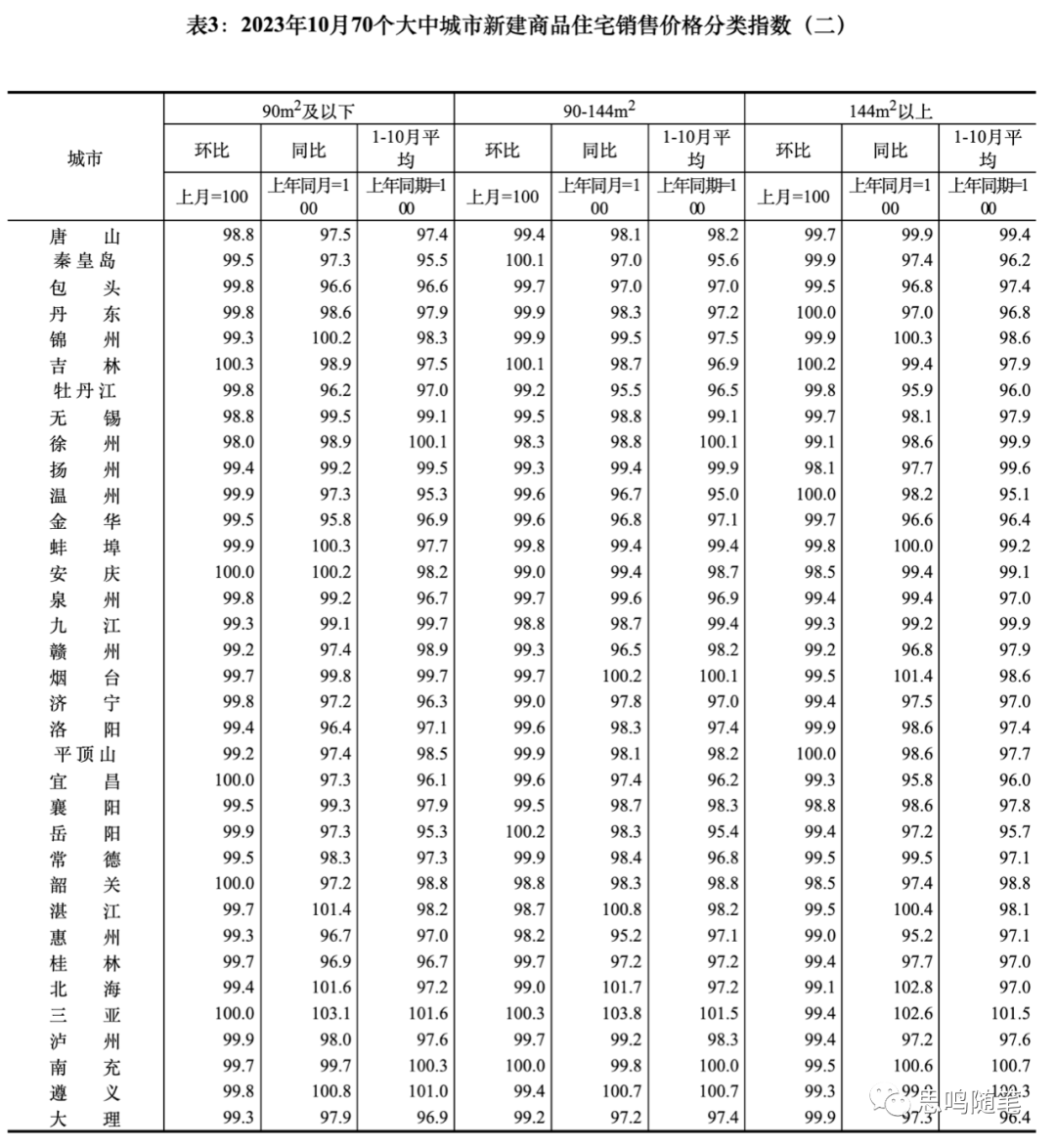 下文截图来自于国家统计局2023年10月份70个大中城市商品住宅销售变动情况,调查范围包括各城市的市辖区,不包括县。