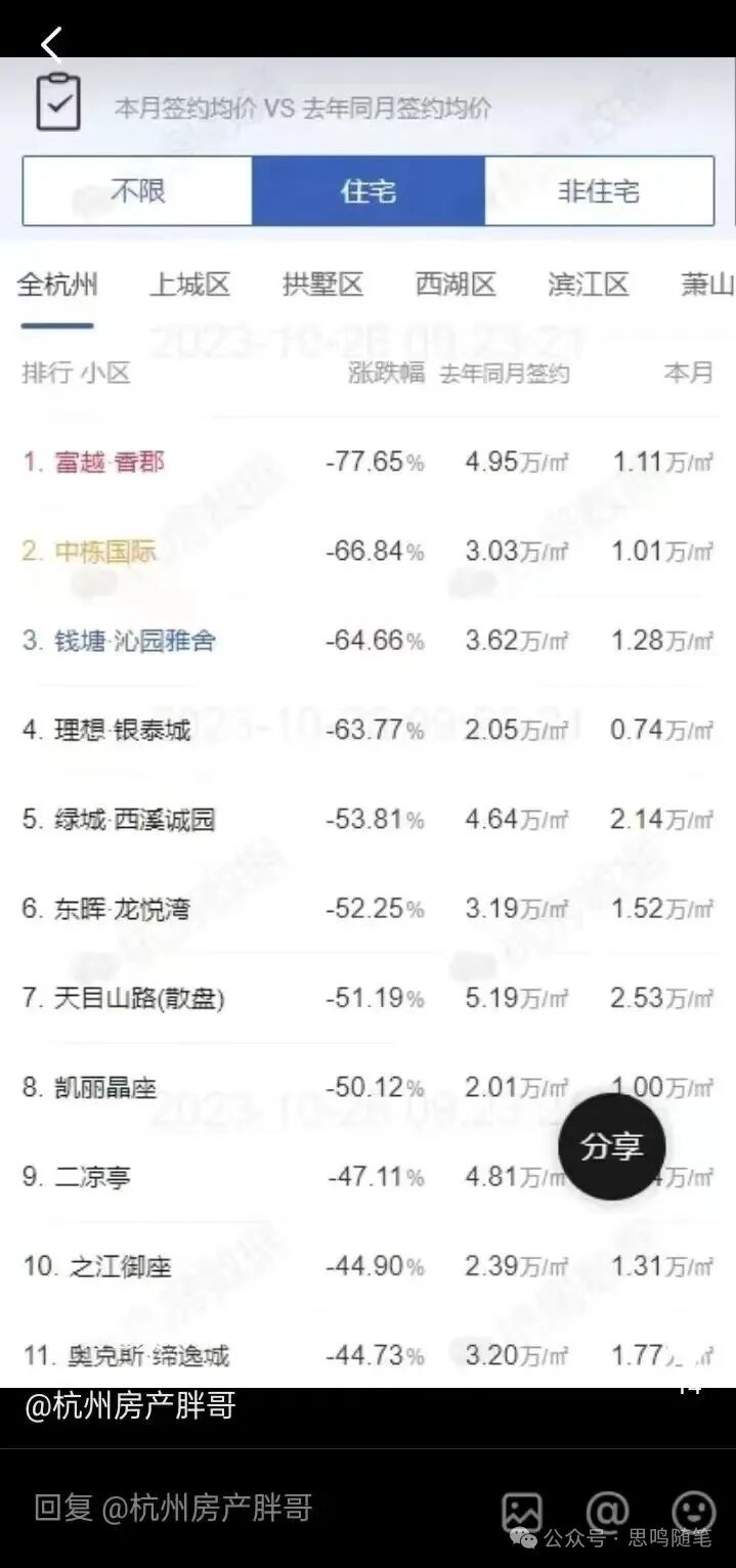 从其它平台获取到这样一张图,是杭州的一个房产中介发的,内容显示:杭州部分地区房价最多一年下跌了77.65%,下跌幅度排名前十的小区,幅度均在44%以上。这对在杭州生活了十多年的我来说,简直是不可思议。