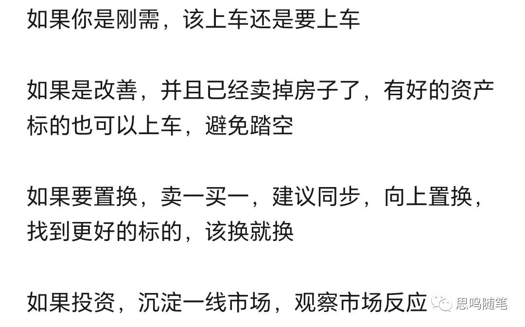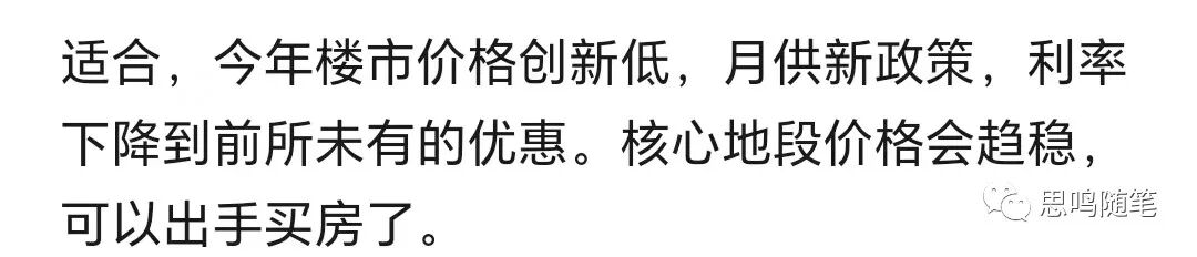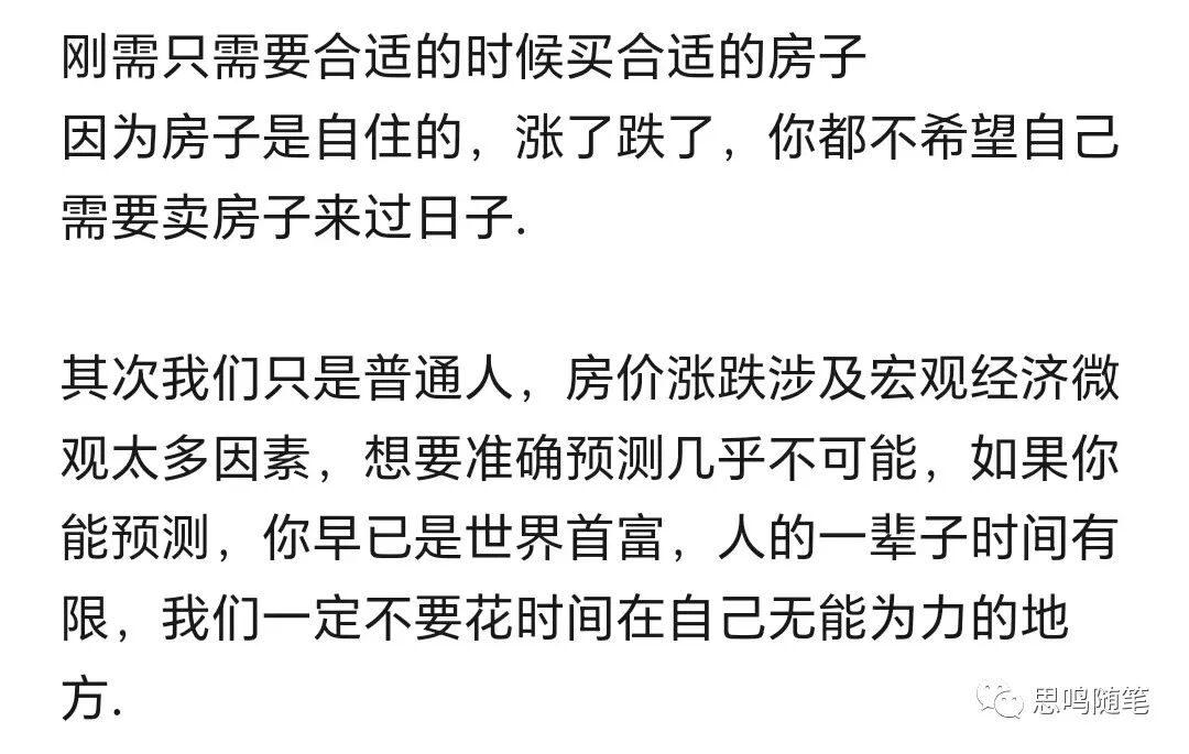 很多时候,可以换个角度出发,不要总是试图和未来做比较,让自己当下的决定犹豫不决。有时也可以和过去做比较,去年这套房子要300万,今年只要270万就能拿下,而你又是刚需买房,那么现在买房,就是赚的。至于以后,其他人可能用更低的价格买下同样的房子,也没啥好后悔的,相比于很多更早买房的人,你已经赚了30万,这个事实不会改变。