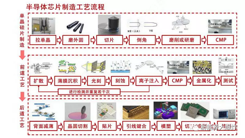 半导体,尤其是里面的高端芯片,作为人类工业皇冠上面的明珠,生产工艺极其复杂,一条生产线大约涉及50多个行业、2000-5000道工序。总的流程上可以分为三大部分:单晶硅片的制造,前道工艺和后道工艺。前道工艺又分几大模块——光刻、薄膜、刻蚀、清洗、注入;后道工艺主要是封装——互联、打线、密封。其中,光刻是制造和设计的纽带。